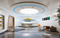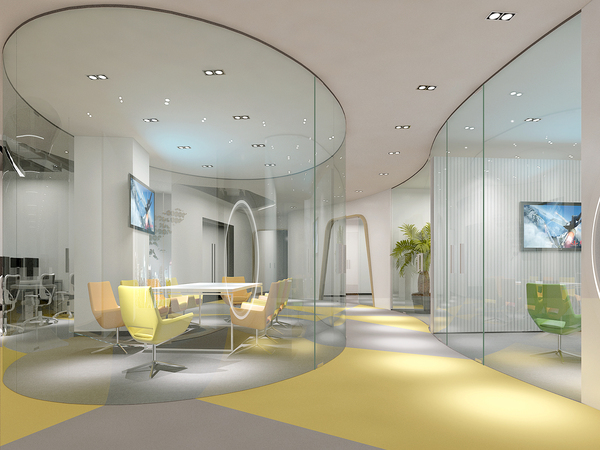 环形落地高透玻璃墙,与整体空间融为一体,墙与地装饰几位的简单,通过色彩强烈对比,放大空间,简单实用为主。