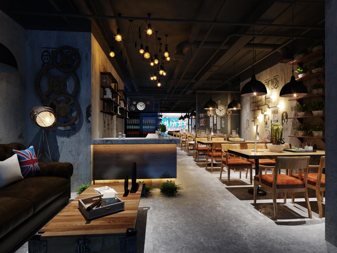 复古红砖墙,金属网格隔断,工矿灯盒原木家具等,地面为水泥自流平,易清理。